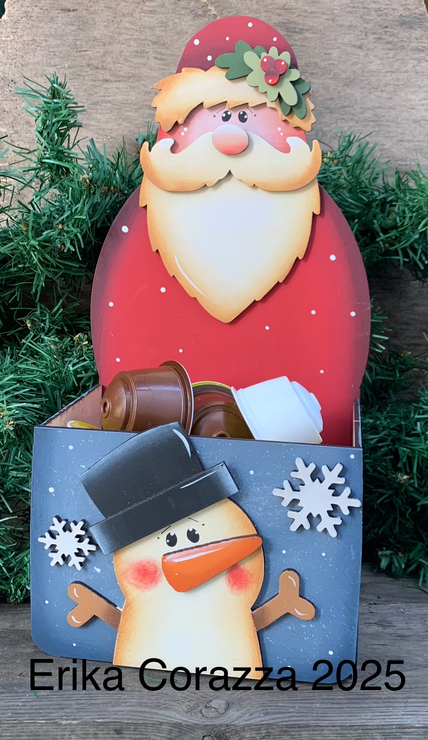 Un box country che profuma di casa e di festa. Decorato con Babbo Natale e un tenero pupazzo di neve, questo box è ideale per conservare le cialde del caffè, o i vostri dolcetti preferiti. Un dettaglio che scalda il cuore e arreda con amore.