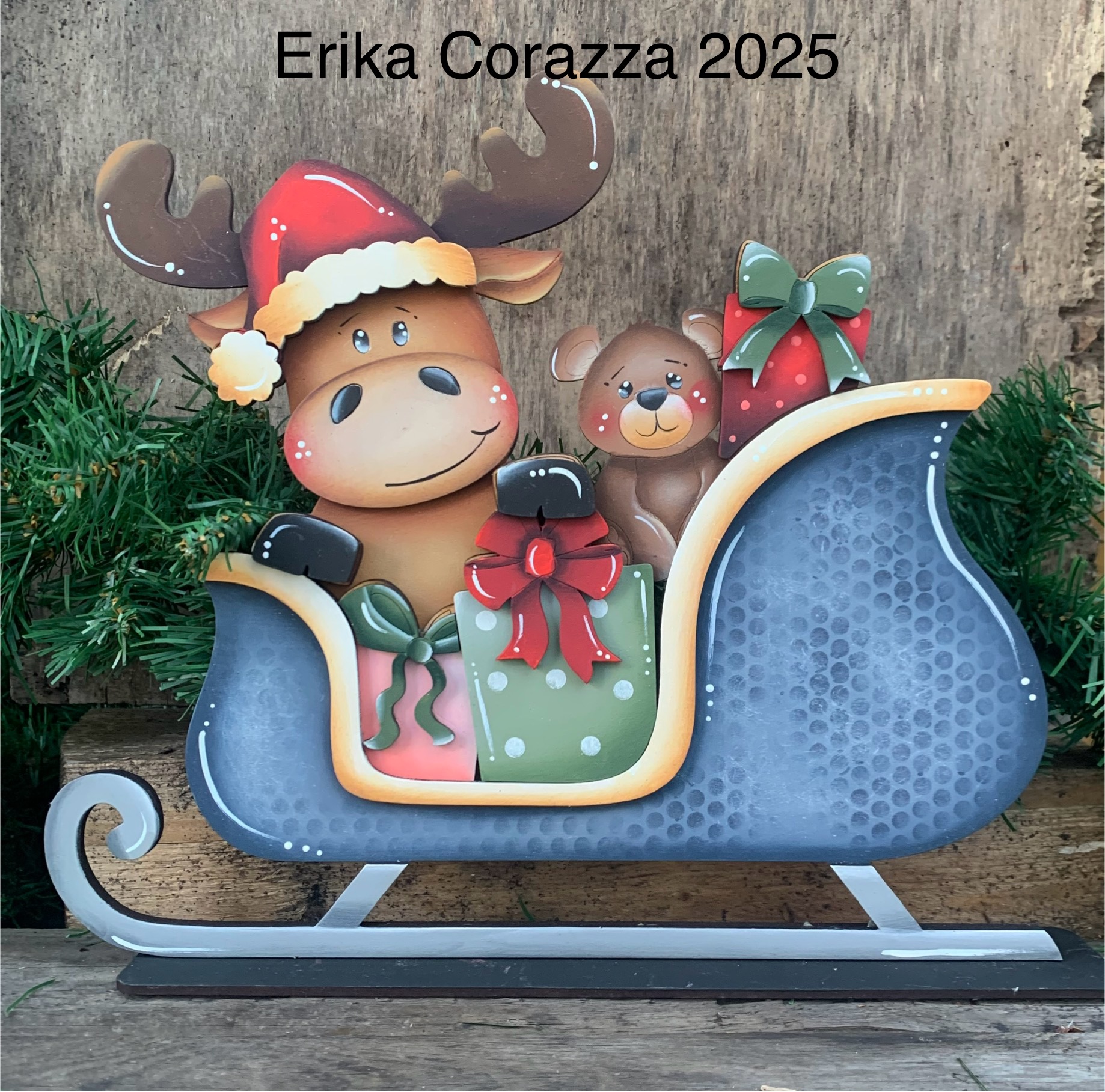 Slitta con alce, orsetto e pacchi regalo.